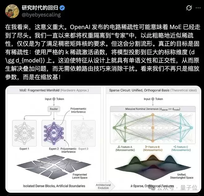 一是会割裂模型的特征流形,导致专家同质化严重、知识冗余等问题,不同专家间的信息协同依赖复杂的负载均衡损失函数调控,稳定性堪忧;二是专家功能边界模糊,无法像Circuit Sparsity模型那样实现微观机制的精准拆解。