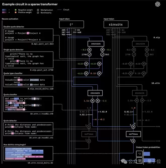 比如处理Python引号闭合任务时,仅需2个MLP神经元和1个注意力头就能构成核心电路,包含专门的引号检测器、类型分类器等功能模块,就像电路图里的电阻、电容,各自管各自的事。