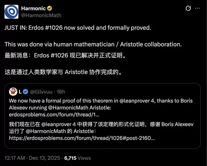 Harmonic正式也宣布了这一消息,其AI系统Aristotle参与了此次解题过程。