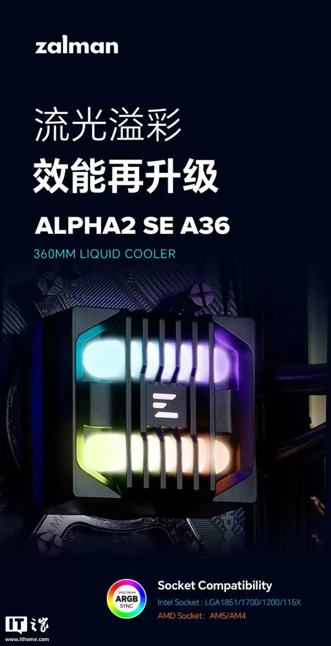 IT之家 12 月 14 日消息,zalman 思民 ALPHA2 SE A36 一体式水冷散热器现已开售,提供黑白两种配色,相比 A36 和 DS A36 主要是将冷头的数显 LCD 屏改为纯 RGB 灯带装饰,到手价 339 元起。