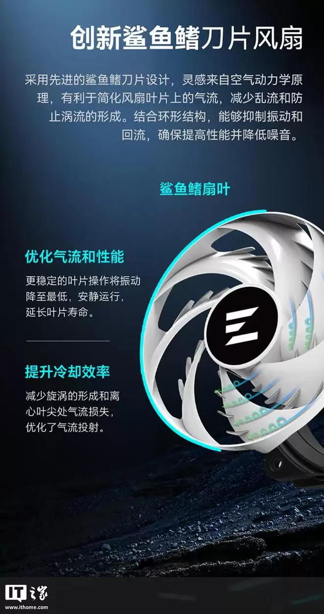 设计方面,这款水冷的风扇采用鲨鱼鳍刀片,有利于简化风扇叶片气流,减少乱流,防止形成涡流并降低噪音,风扇侧面板采用 3 合 1 一体式单框设计,简化硬件拆装过程,预装防震橡胶垫,有利于减少震动降低噪音。
