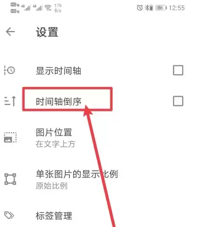 在设置菜单里,选择【时间轴倒序】选项,根据提示完成切换,你的日记列表就会按倒序排列了。