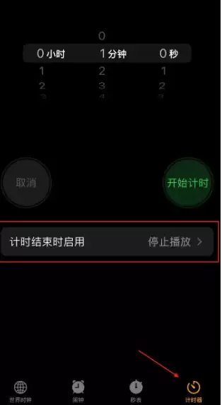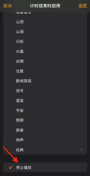 3. 选择结束动作:点击“计时结束时启用”,滑动至底部并选择“停止播放”,最后点击“设定”保存。