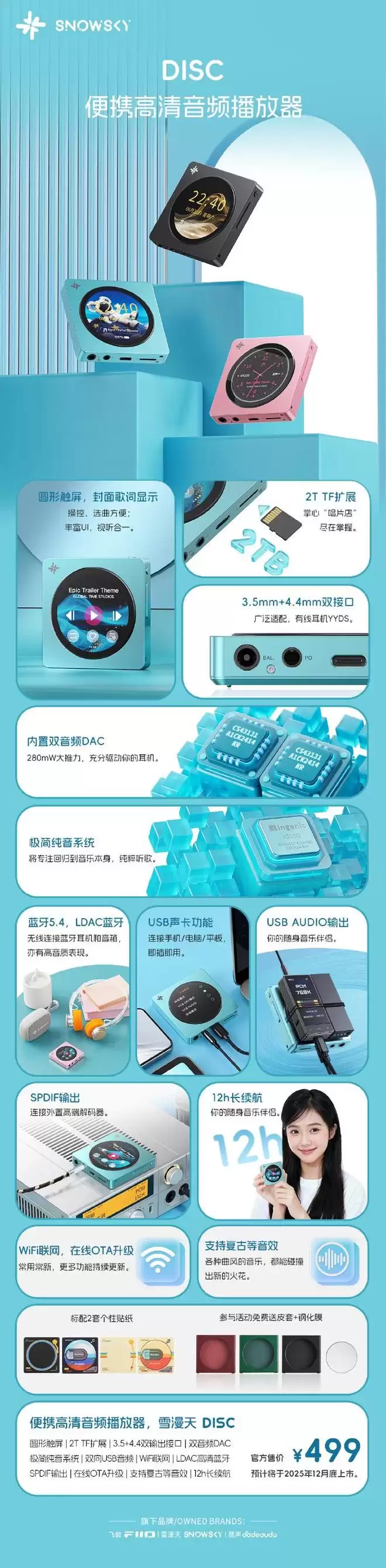 IT之家 12 月 13 日消息,傲子品牌雪漫天今日发文预热其全新 DISC 便携式音频播放器。产品采用仿 CD 机外观设计,内置 3.5mm 与 4.4mm 双耳机接口,可适配绝大多数 Hi-Fi 耳机,预计将于本月晚些时候上市,售价 499 元。