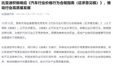 其中,国产车销冠企业比亚迪在声明中指出:比亚迪坚持长期主义,将以《指南》为指引,持续优化自身的价格管理和合规体系建设。承诺将严格落实规范价格竞争行为的要求,保障消费者的利益,坚决杜绝任何形式的价格欺诈和不正当竞争行为。(快科技)