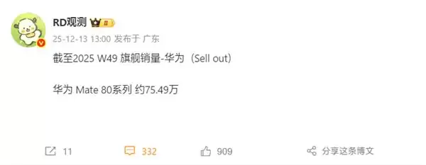 12月13日消息,据博主“RD观测”透露,截至2025 W49,华为Mate 80系列的销量约75.49万。这个成绩已经大幅超越了国内多家厂商的旗舰机型,仅次于小米17系列,与REDMI K90系列大致相同,但Mate 80系列才刚刚上市不久。其中,W49当周份额仅次于iPhone 17 Pro Max,位列国内市场第二,也是除了苹果唯一能进入前三的旗舰。在4000元以上价位段,Mate 80系列已终结iPhone 17系列长期垄断前三的局面,代表国产手机夺回高端市场。