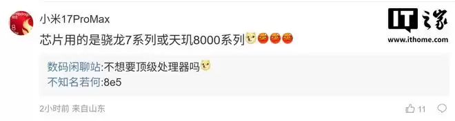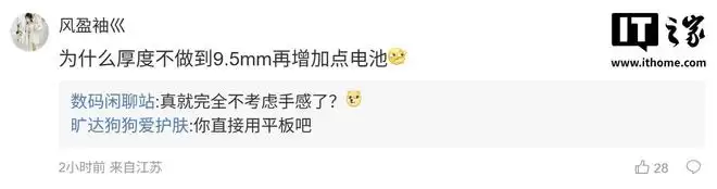 随后有用户在评论区询问:“为什么不做厚一点到9.5毫米,再把电池容量增加一些呢?”博主回复道:“那样就完全不在乎手感了吗?[狗头斜眼]”另一位用户则提问:“芯片会用骁龙7系列,还是天玑800系列?[狗头斜眼]”博主则回答道:“是不想要顶级处理器吗?[狗头斜眼]”