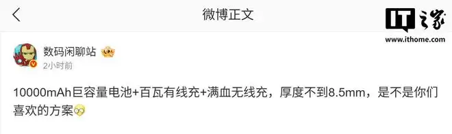 IT之家12月15日消息,数码闲聊站今日在微博透露,某厂新机将搭载10000mAh超大容量电池。