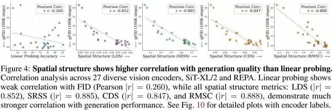 令人震惊的相关性出现了(如上图所示):传统的线性探测准确率(代表全局信息)与生成质量(FID)的相关性极低,皮尔逊相关系数仅为 r = -0.260。而空间结构指标(LDS) 与生成质量的相关性高达 |r| = 0.852!