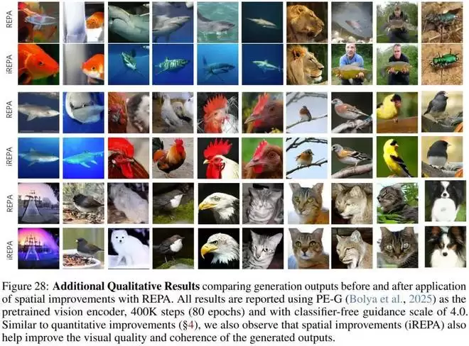 如下图所示,对比标准 REPA 和 iREPA 生成的样本(如鱼、公鸡、猫等类别),可以发现 iREPA 生成的图像在物体轮廓、纹理细节和整体结构的连贯性上都要优于前者。