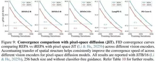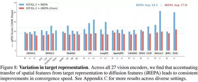 如下图所示,在横跨所有测试的编码器中,iREPA(红色柱状图)的生成 FID 分数均低于标准 REPA(蓝色柱状图)。