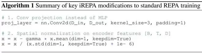 基于此,该团队提出了iREPA。但其核心改动非常简单,代码实现甚至不到 4 行,主要包含两个修改: