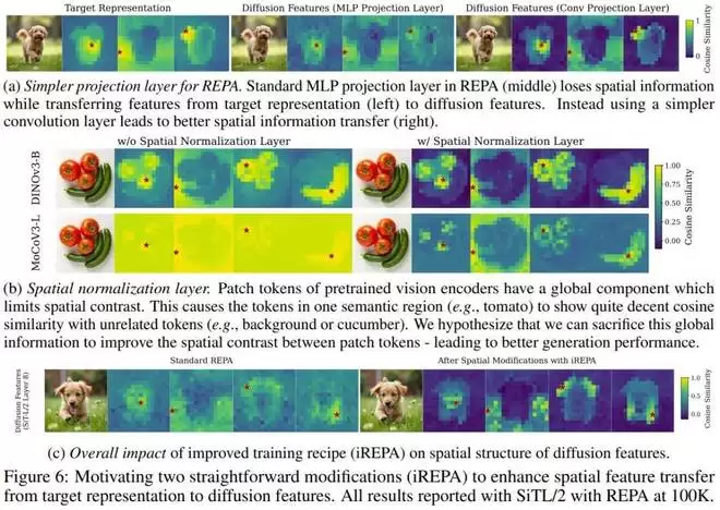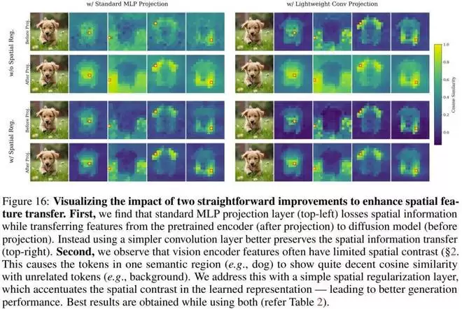 标准的 REPA 使用 MLP 将扩散模型的特征映射到目标表征的维度。作者指出,MLP 是「有损」的,会破坏 patch 之间的空间对比度。