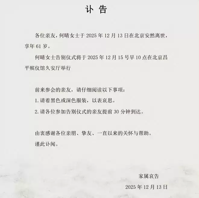 12月14日,何晴家属发布讣告,宣布她在北京安然离世,享年61岁,告别式将在大后天举行。