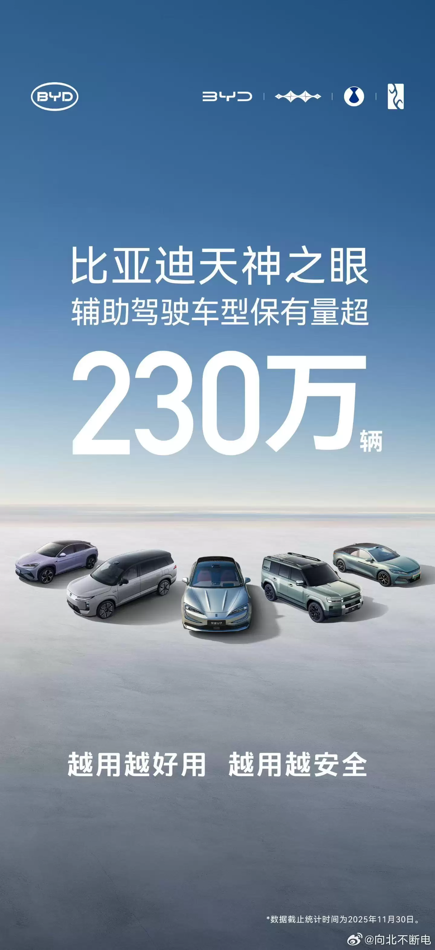 IT之家12月15日消息,博主@向北不断电今日分享称,比亚迪搭载“天神之眼”高阶智能驾驶辅助系统的车型,累计保有量已突破230万辆。这些车辆每天产生的真实道路驾驶数据超过1.5亿公里(数据统计截止时间为2025年11月30日)。
