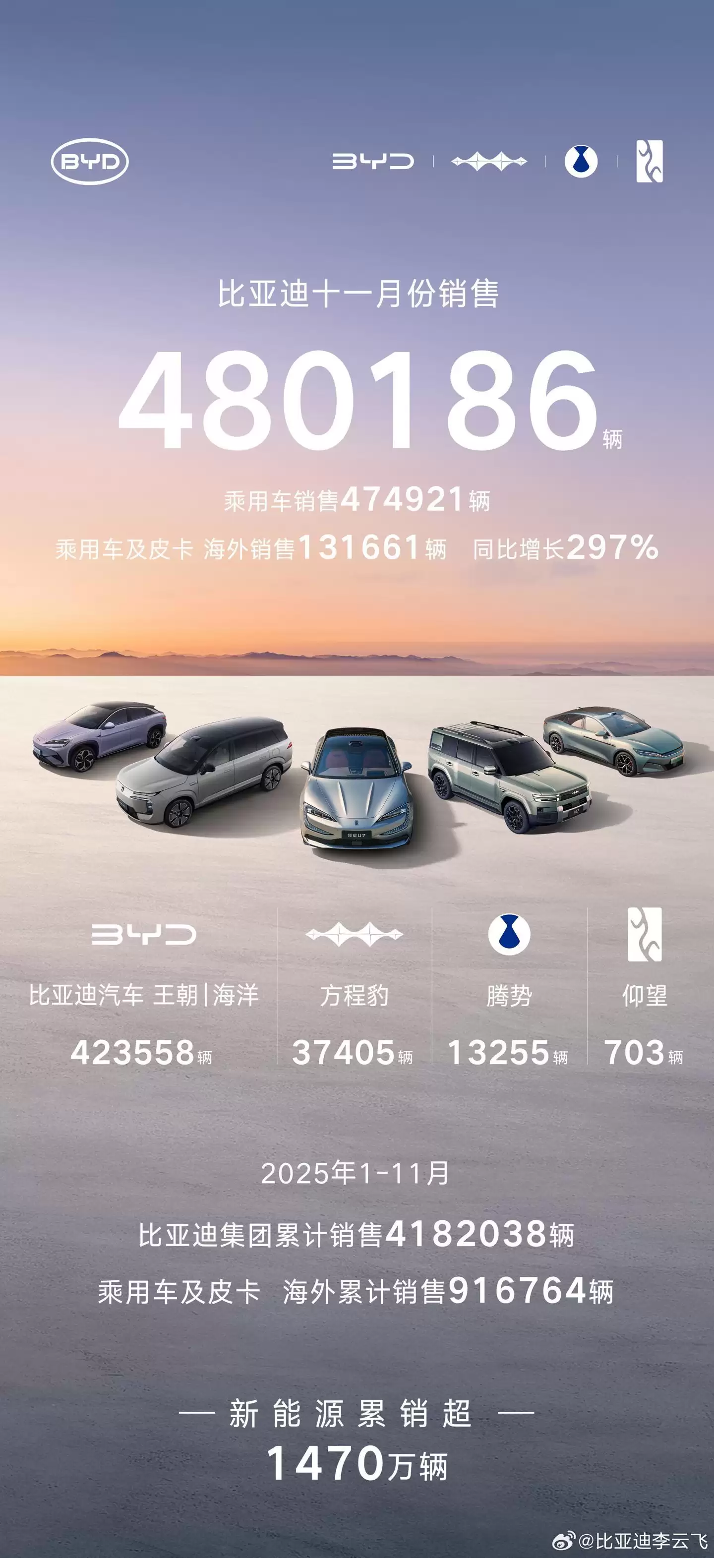 IT之家注意到,今年11月,比亚迪汽车单月销量为480,186辆(去年同期为506,804辆)。今年1月至11月,比亚迪汽车累计销量已达418万辆,同比增长11.3%。在公司产能方面,2025年11月,其新能源车动力电池及储能电池装机总量约为27.669GWh;2025年1-11月累计装机总量约为258.282GWh。