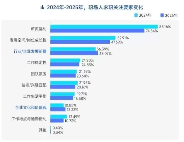随着招聘市场回暖,职场人的求稳心态出现松动。职场状态“没有变化”的人才占比从2024年的45.30%下降到2024年的41.41%,2025年进一步下降至40.51%,“主动辞职”的人才占比显著上升,达到21.13%,较2024年提升8个百分点,较2024年提升2个百分点。在择业因素方面,求职者对于薪资福利的关注度出现下降,从去年的85%降至74%,对于行业前景、企业文化与价值观的关注度均有小幅上升。