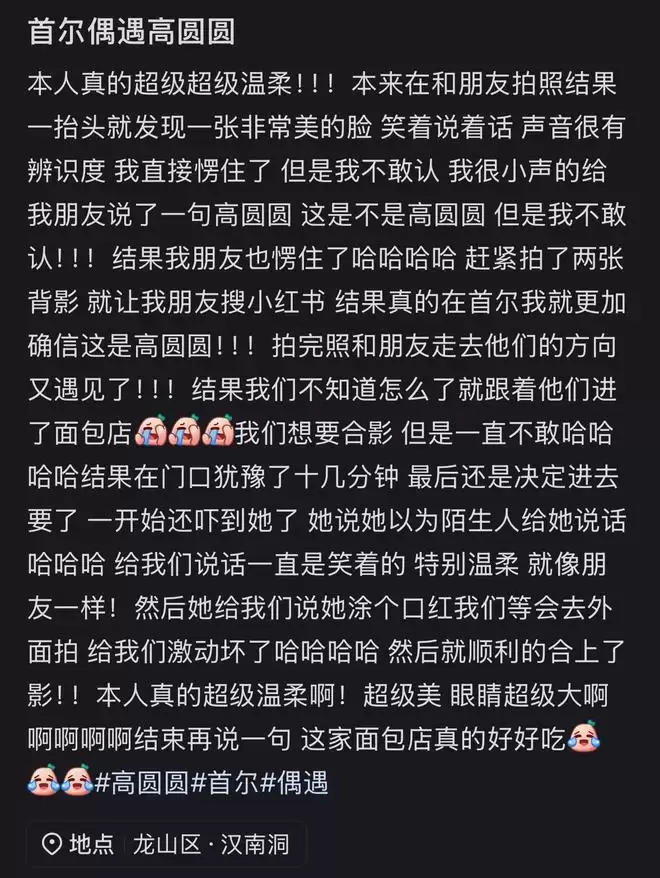 不过网友第一时间并不敢确认,毕竟偶遇明星非常不容易。她便先拍照在某个社交平台中搜索,发现高圆圆当下的确就在韩国首尔。于是她和朋友便上前与高圆圆攀谈。