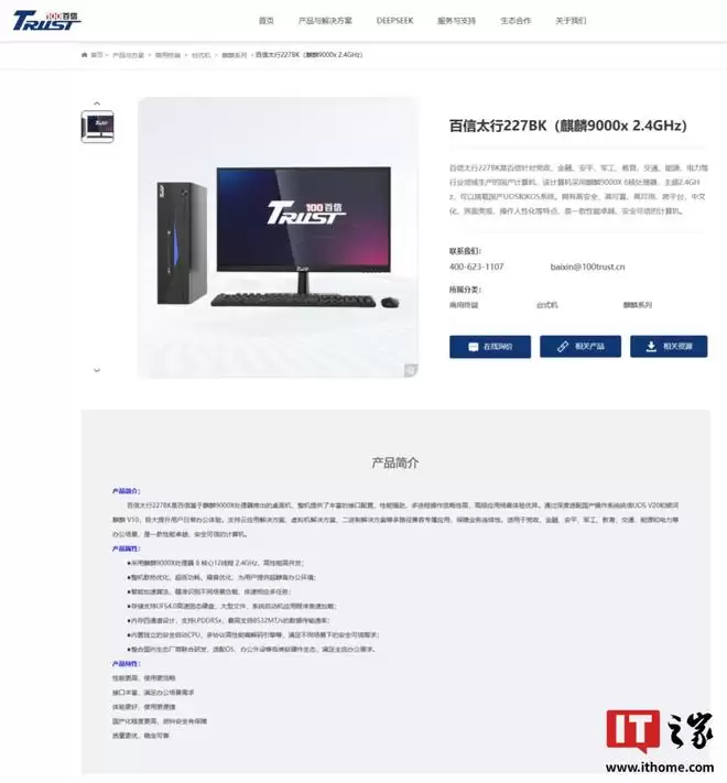 IT之家从百信官方获悉,百信太行 227BK 是基于麒麟 9000X 处理器打造的桌面机,已深度适配国产操作系统统信 UOS V20 与银河麒麟 V10。它支持云应用、虚拟机及二进制转译等多种兼容方案,可运行各类专属应用,适用于党政、金融、安平、军工、教育、交通、能源和电力等办公场景。