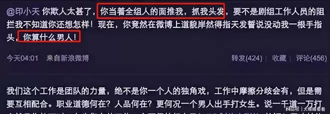 他在斥责印小天的时候,还不忘讽刺“希望导演以后找我拍戏,我不打人”。
