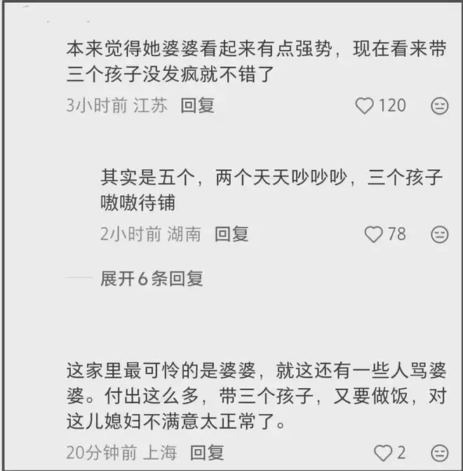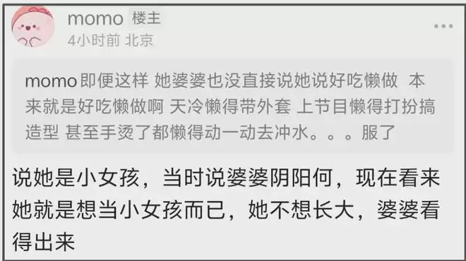 还记得何美延婆婆在节目上提到何美延心态不成熟像个小女孩,透露儿媳平时不照顾小孩,还遭到了何美延反驳,外界也质疑何美延婆婆撒谎阴阳儿媳,然而随着节目播出,网友发现何美延婆婆说的都是大实话,她甚至还帮何美延找补,绝口不提自己作为奶奶一个人带三个娃的辛苦。