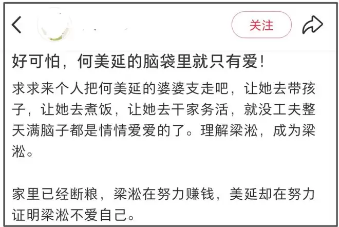 梁淞对着何美延直言家里断粮了,何美延还在强调你不够爱我,之前还在批判梁淞的网友都看不下去了,想说何美延还是太闲了,钱是老公负责赚,孩子是婆婆帮忙带,才会一天天满脑子情情爱爱。