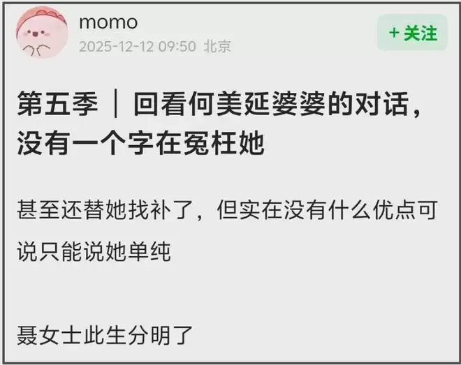 《再见爱人》第五季又有人风评反转了!不过这一次不是某位节目嘉宾,而是嘉宾的婆婆——最新一期节目播完,被吐槽是知否小秦氏的何美延婆婆终于此生分明了,不但成功洗白,还收获了大量网友同情。实际上,何美延婆