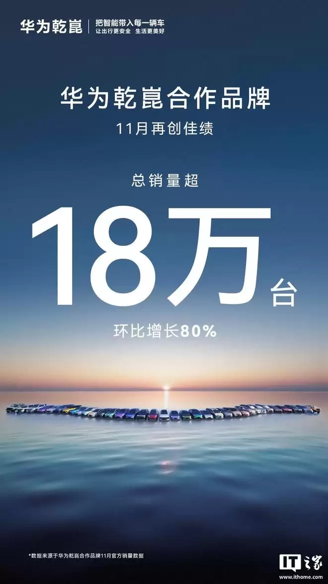 此前IT之家曾报道,本月初,华为乾崑智能汽车解决方案公布了一组亮眼数据:华为乾崑伙伴品牌在11月的总销量超过18万台,环比增幅高达80%。而在11月20日晚举行的华为乾崑生态大会上,华为智能汽车解决方案BU CEO靳玉志正式宣布:搭载华为乾崑智驾ADS的33款合作车型,月度销量历史性地突破10万台大关,创下了新的纪录。