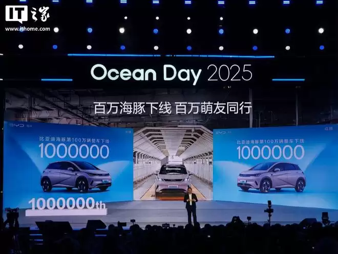IT之家12月15日消息,在今晚举办的“奔涌2025”比亚迪海洋四周年Ocean Day用户盛典活动上,比亚迪第100万辆海豚正式下线。据介绍,这款新车也是国内A0级市场最快达成百万销量的车型,连续三年位居国内A0级市场销量榜首,并在2024年实现连续10个月销量突破3万辆。