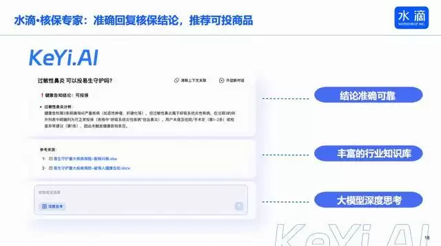 “KEYI.AI”核心在于“专业知识库+大模型推理能力”的深度融合,覆盖上千款当期及历史热卖保险产品条款,整合千万级核保案例与医疗数据,可自动解析用户健康信息,如体检报告中的结节描述、慢性病病史,并与保险条款中的健康告知要求精准匹配。例如,用户咨询“过敏性鼻炎能否投保某重疾险”时,系统可快速定位条款中“呼吸系统炎性疾病的例外约定”,结合用户住院史、手术史等补充信息,10秒内给出“可投保”结论,并标注参考条款来源,解决传统审核中“结论模糊、依据不明”的问题。