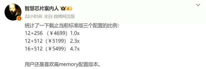 而16GB+512GB版本售价5499元,占比高达4.7倍,这一数据直观反映出各存储版本中,用户明显更倾向于选择高配置版本。