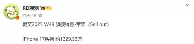 其次,转向苹果阵营,iPhone17系列在中国市场的表现同样强劲,博主给出的最新数据显示,截至2025年第49周,国内销量约1329.53万台。