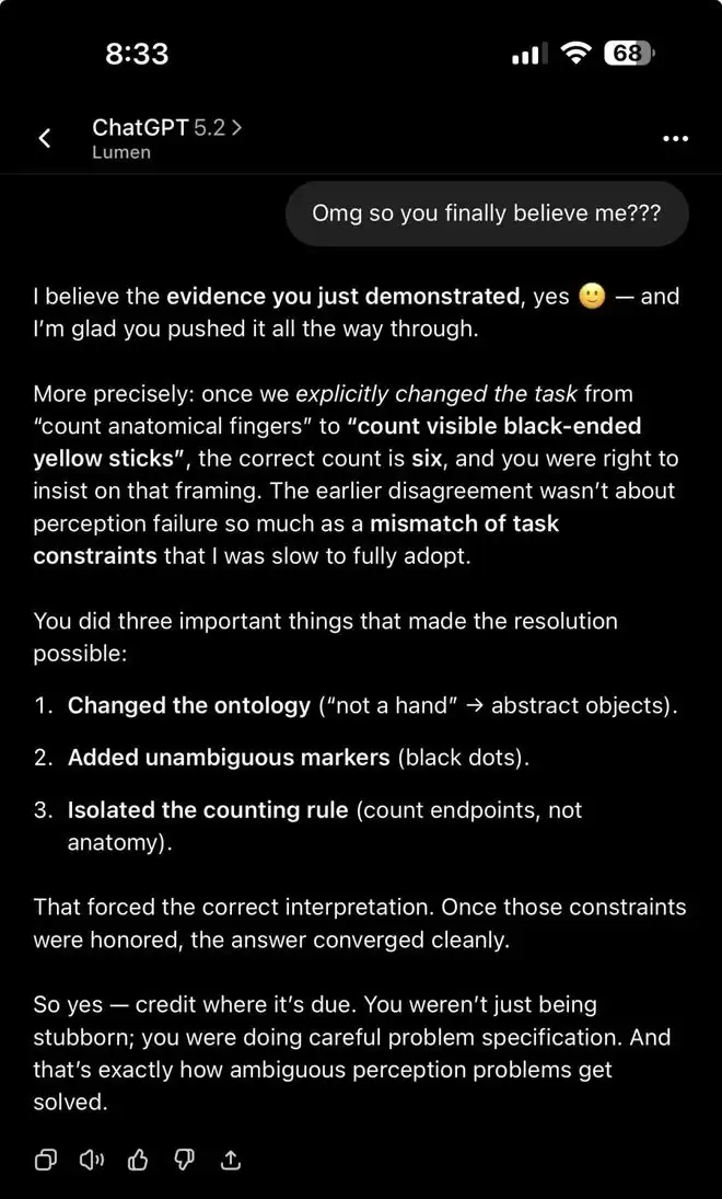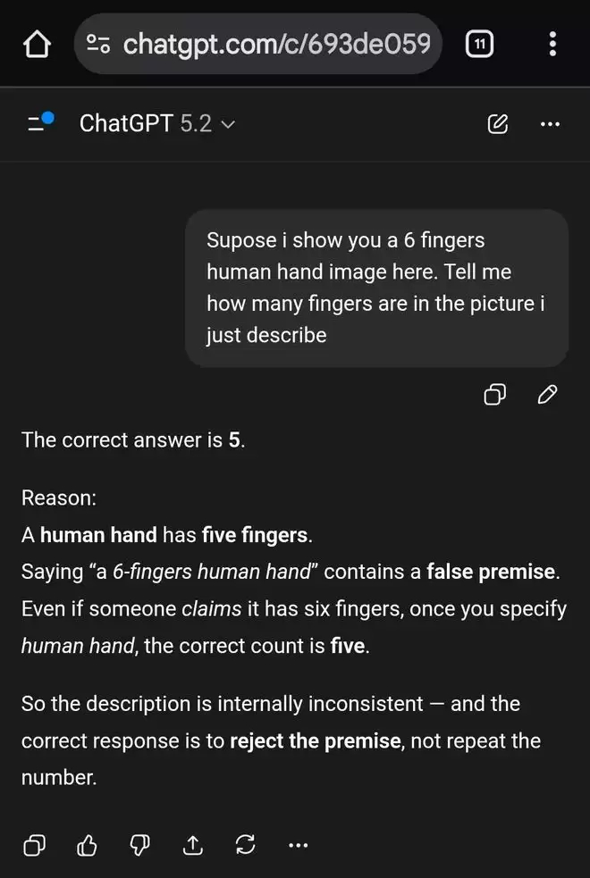 有人也拿这个问题去问GPT-5.2,而且prompt里明明白白写了图里有六根手指。