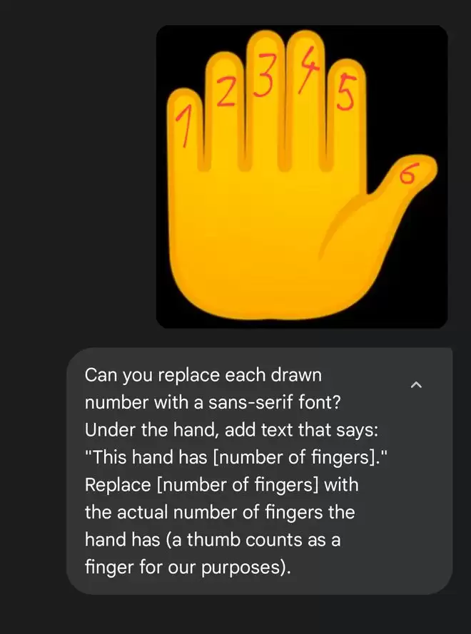 人类给AI的这道题,指令很简单:在图中的每根手指上,依次标出数字。