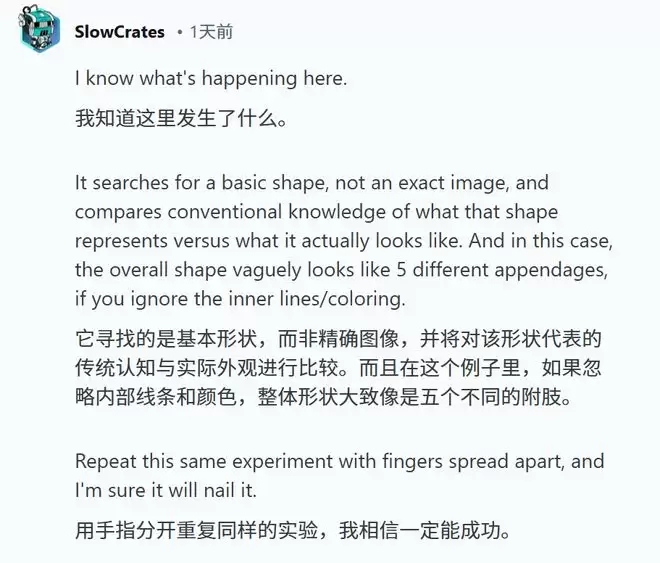 有人给出这样的解释:AI找的是基本形状,而非精确图像,然后将该形状代表的传统认知和实际外观进行比较。