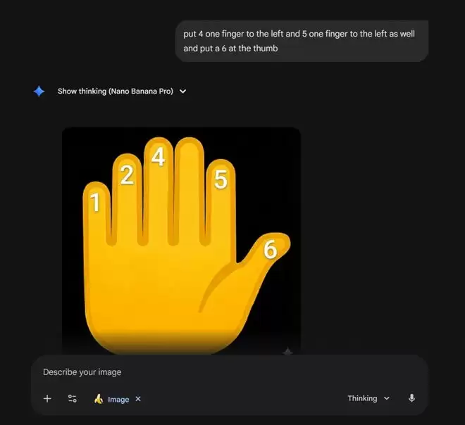 结果,Nano Banana Pro理直气壮地在这只手上标出1、2、3、4、5,直接略过了其中一只手指。
