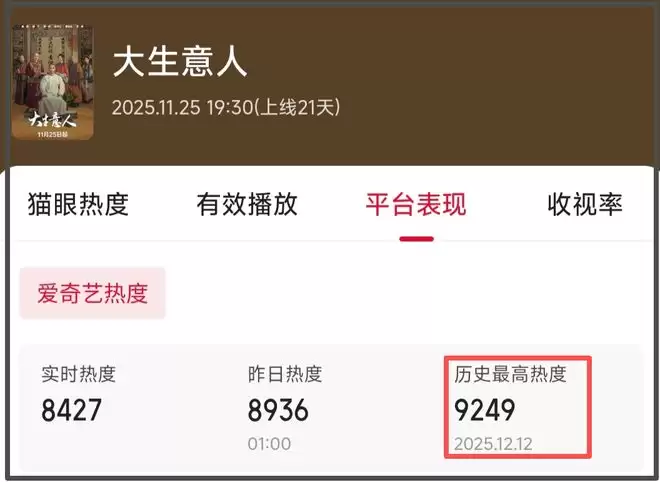 更让人哭笑不得的是,《大生意人》会员收官的日子是13号,这一天还是周六,可以称得上是热度上的话黄金时间。但是,该剧的热度在这一天却不增反降,收官日热度堪堪维持在9000以上。收官次日,也就是周日,该剧的热度直接跌破9000。完结之后,剧集的热度更是一跌再跌,该剧之后恐怕不会有太突出的长尾效应了。