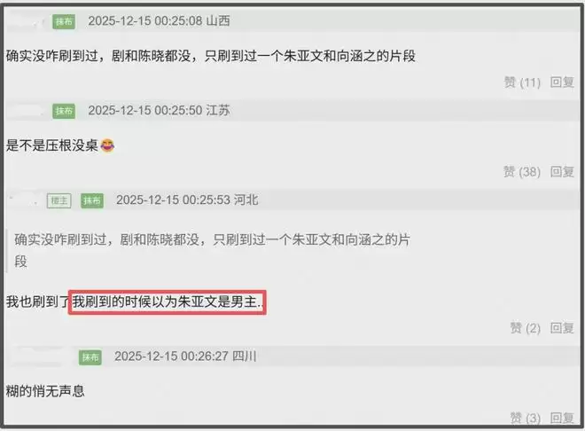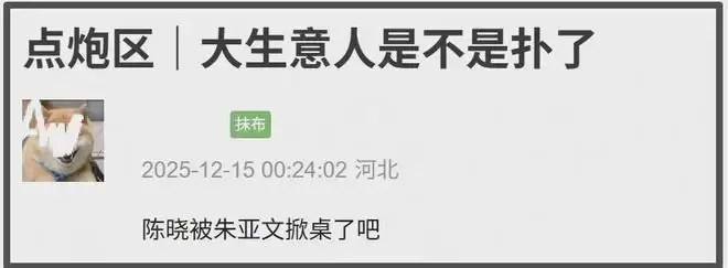 值得一提的是,在《大生意人》本就成绩一般的情况下,陈晓还被男二掀了桌。比起陈晓和孙千在剧中的主cp,朱亚文和向涵之这对剧中的副cp热度明显更出圈,甚至有网友因为刷到的相关片段太多,误以为该剧的男主演是朱亚文。