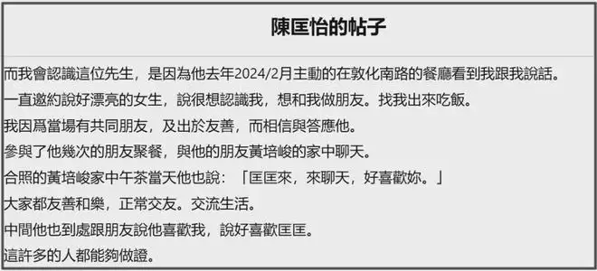 按照陈匡怡的说法,她2024年才认识郭永福,对方主动和陈匡怡搭讪,得知双方有共同朋友之后,陈匡怡就参加了几次郭永福组织的朋友聚餐。
