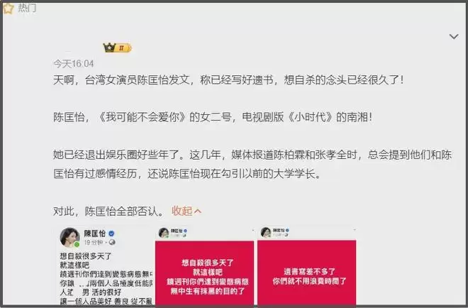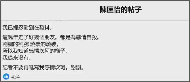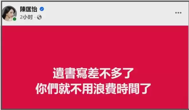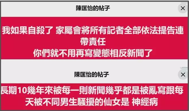 ——陈匡怡不是因为没谈恋爱、没结婚情绪崩溃的,而是被台媒和富商逼到写遗书的,最后就希望陈匡怡珍惜生命,不要陷入自证情绪吧。