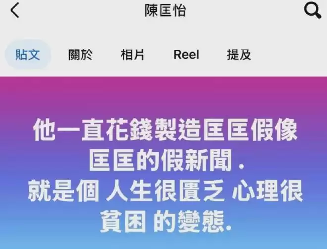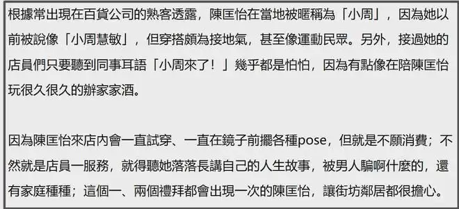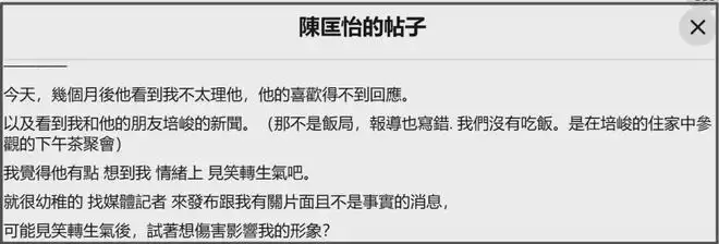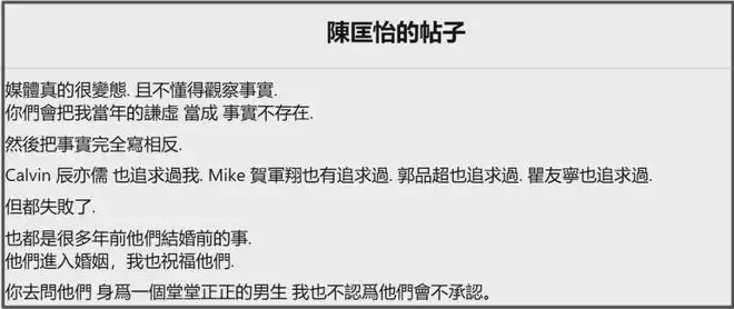 其实陈匡怡的诉求很简单,她只是希望富商不要再造谣,台媒不要再把她塑造成感情坎坷的疯女人了。