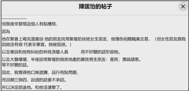 紧接着,陈匡怡发现郭永福人品糟糕,在酒局上大聊潜规则,诋毁朋友、给女性造黄谣,口无遮拦还爱撒谎,陈匡怡立马决定疏远郭永福,干脆和对方断联了。