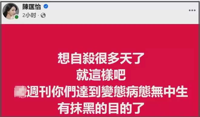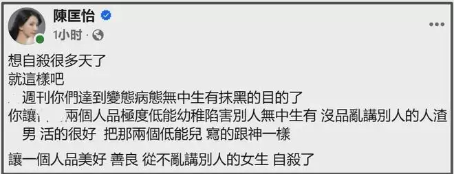 台媒又干缺德事了!最近38岁女星陈匡怡接连更新多条社媒动态,情绪崩溃表示想要自杀,怒斥某台媒变态病态无中生有毁人名节,直言自己遗书都写好了。