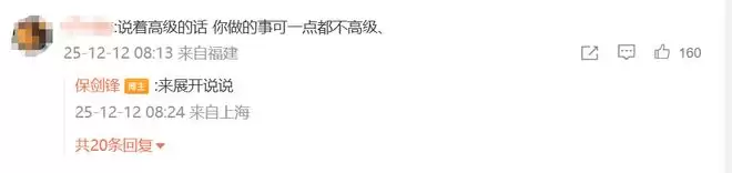 某条评论指责他“说着高级的话,做的事可一点都不高级”,保剑锋直接回怼:“来展开说说。”