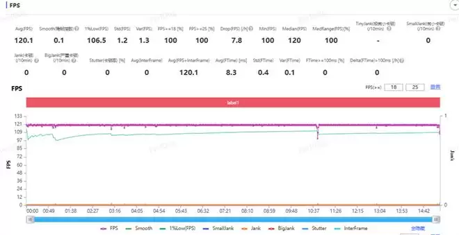 《王者荣耀》的测试中,120帧高清画质下,平均游戏帧数达到120.1FPS,稳帧指数0.1,1%low帧达到了106.5FPS,大型团战有些微掉帧,但总体帧数没有掉下过100FPS。