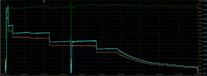 在插入充电器后的第53秒处达到功率封顶,随后迅速回落到51W的水平,2分半后降低到45W,中间经过一个几瓦的小掉功率,在14分时正式降低到35W。