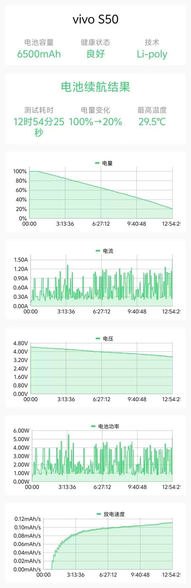 测试结果显示,vivo S50在测试中坚持了12小时54分。折算下来整机满电续航能坚持16小时。超长的续航时间完全能够撑起2天一充。
