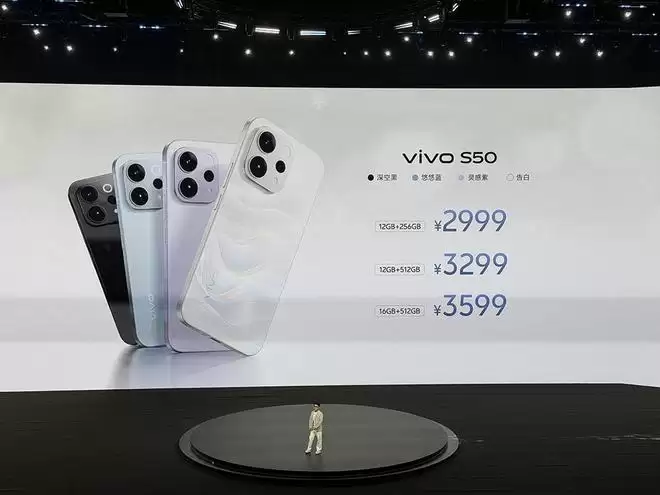 vivo S50标准版提供四种配色与三个存储版本,12GB+256GB售价2999元,12GB+512GB售价3299元,16GB+512GB售价3599元。