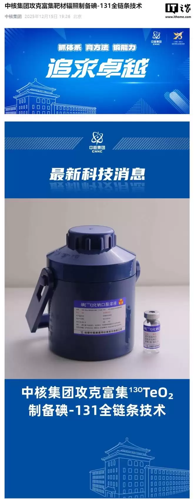 IT之家12月15日消息,中核集团今日宣布,在中核集团同位素生产协同平台的统筹下,我国医用同位素自主化攻关再传捷报。