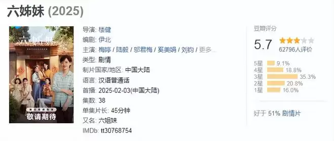 不过同样是被寄予厚望的年代剧《六姊妹》,播出以后却不是太让人满意。